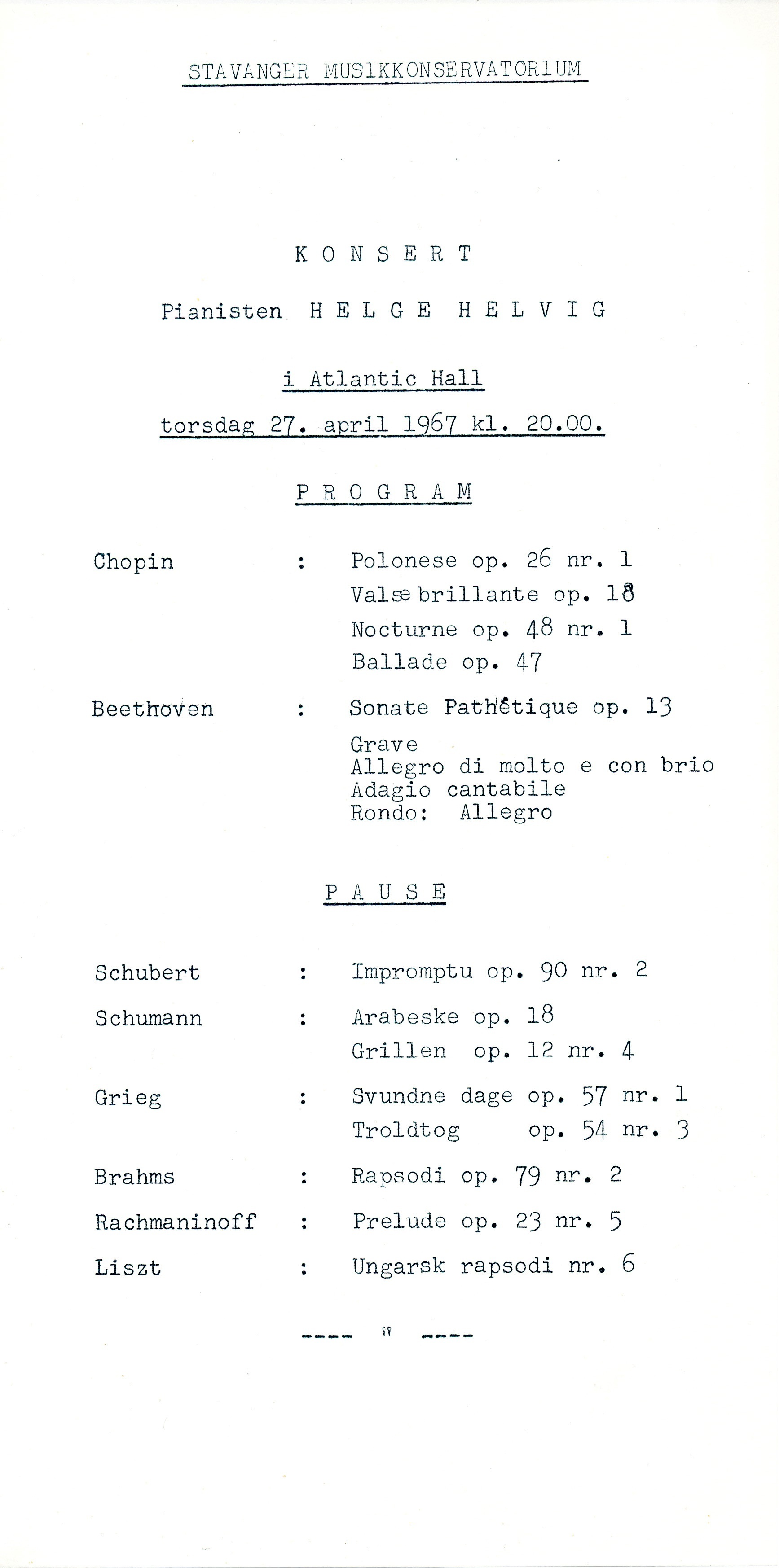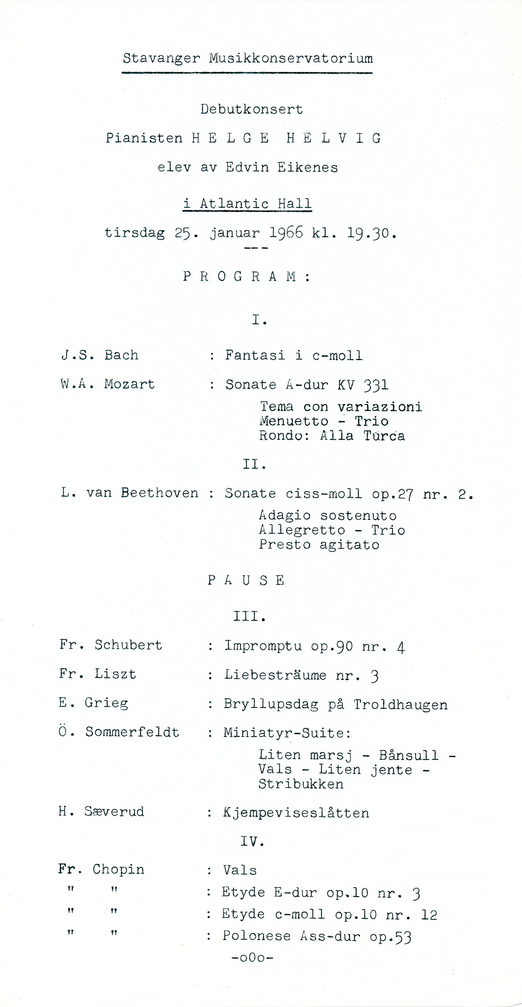 debutkonsertopptak Pianist: Helge Helvig Sted: Atlantic Hall Kopidato: ukjent. Konsertdato: 25. januar 1966 Merknad: Ekstranummeret er ikke med på kopien. |