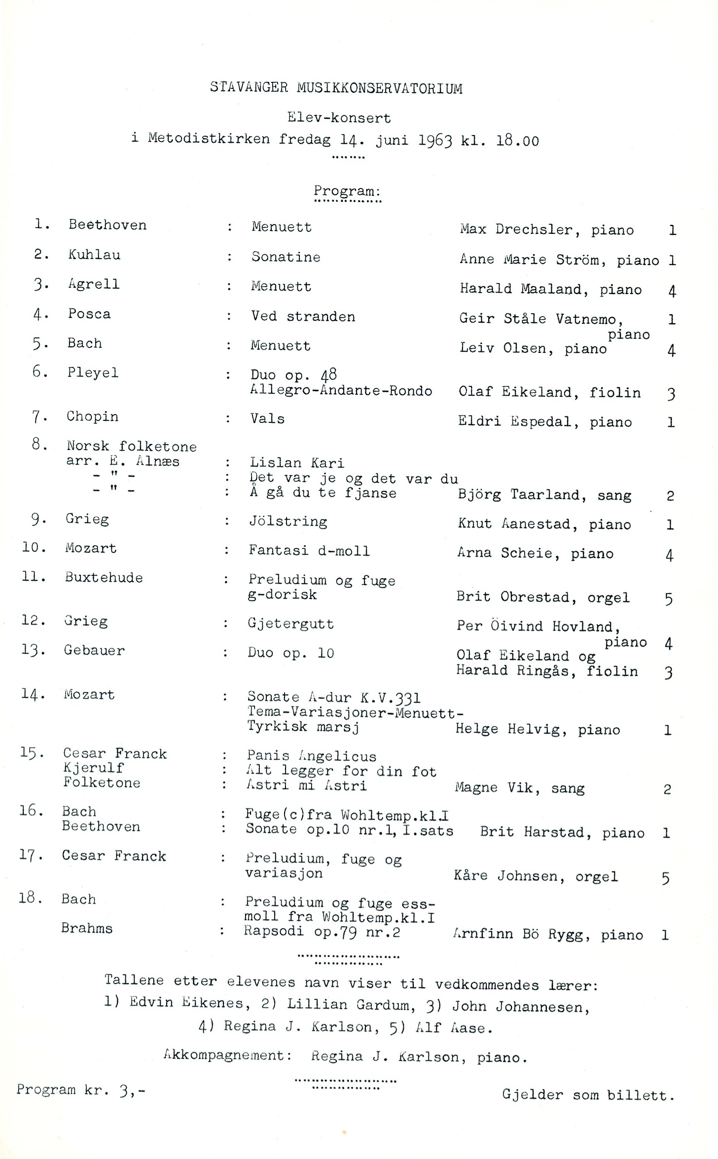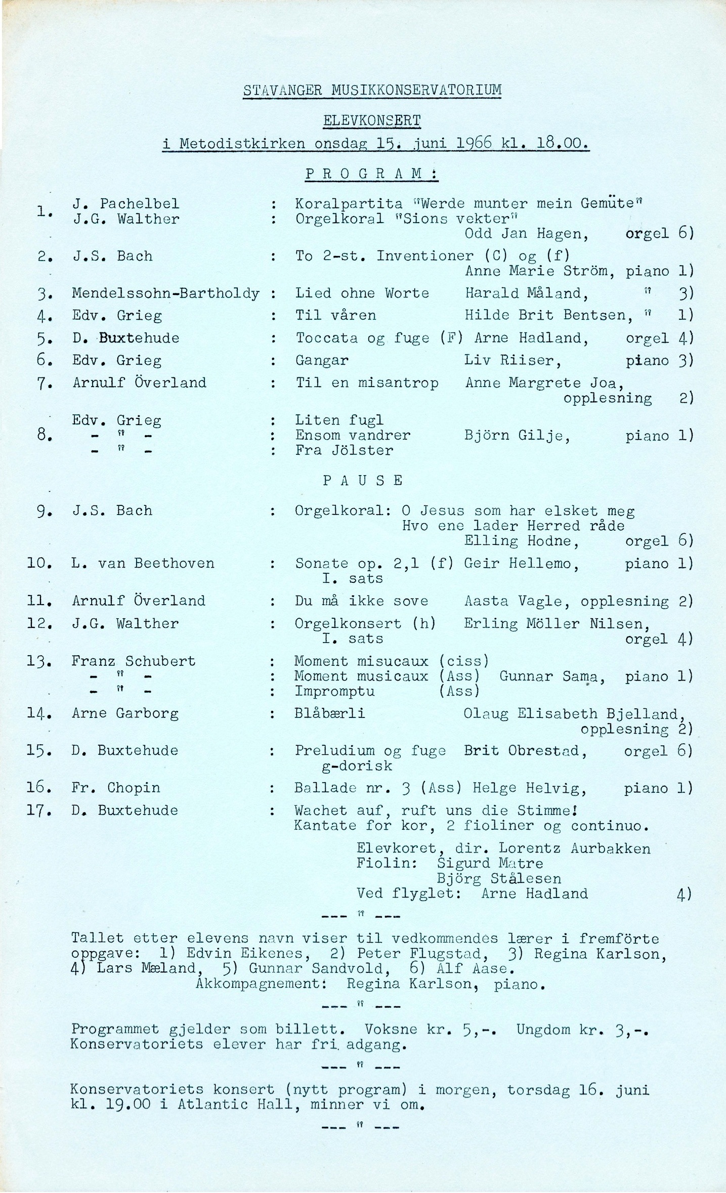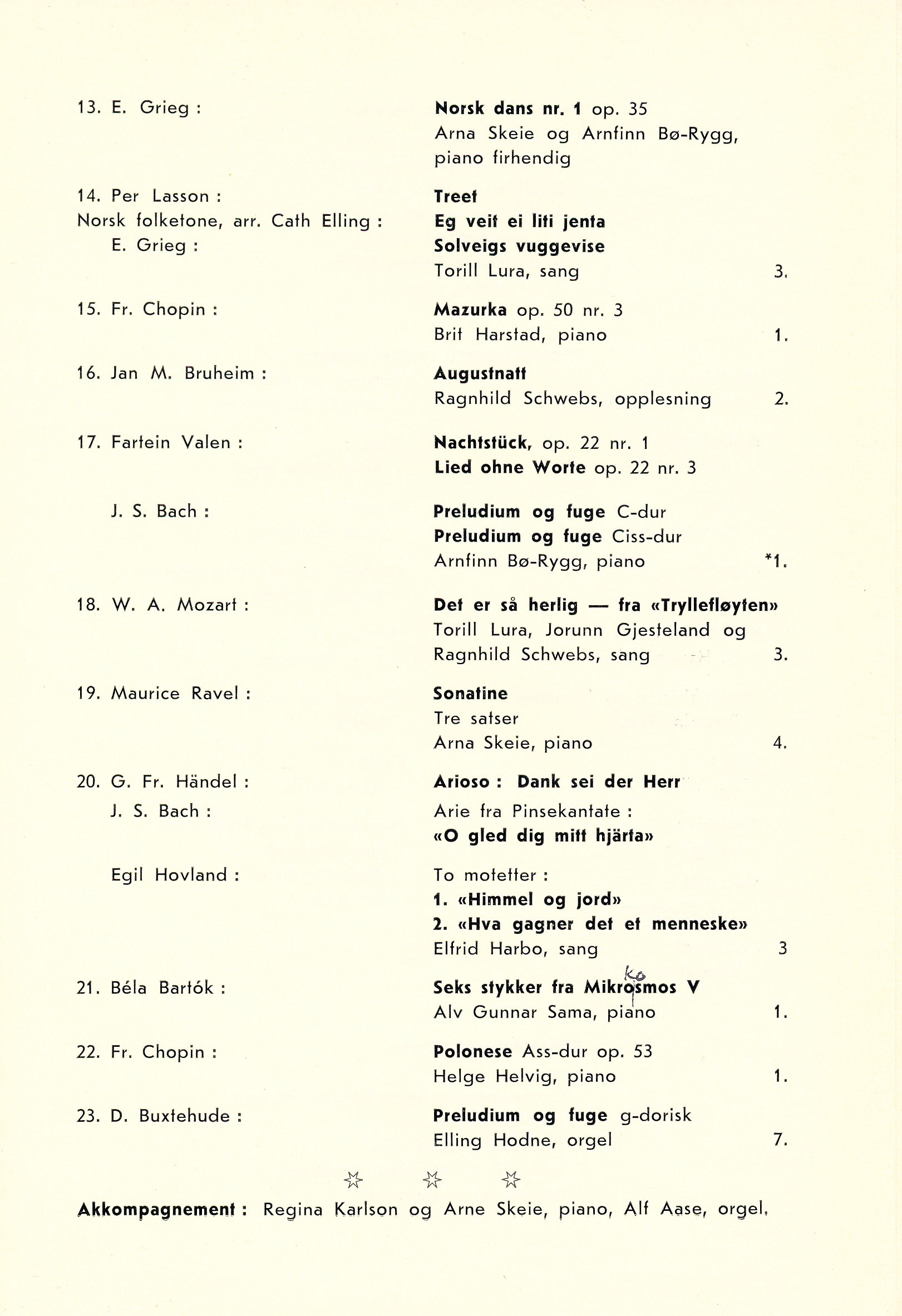 Konservatoriekonsert nr. 23. Konsertdato: 14. juni Digitalisert i august 2021. Spilletid: 131min Edvin Eikenes holdt en tale før første programpunkt. Programpunkt 1 ble endret til Mozart: Menuett Programpunkt 7: Chopin-valsen som ble spilt, var op. 69 nr. 2 I programpunkt 8 står det Å gå du te fjanse. Det skal være Å gå du te fjause. Programpunkt 11 og 17 falt bort pga et problem med orgelet. Etter programpunkt 18 opplyste Edvin Eikenes at det i 1963 var 10 år siden Arnfinn Bø-Rygg første gang spilte på en konservatoriekonsert i Metodistkirken. ![]() |