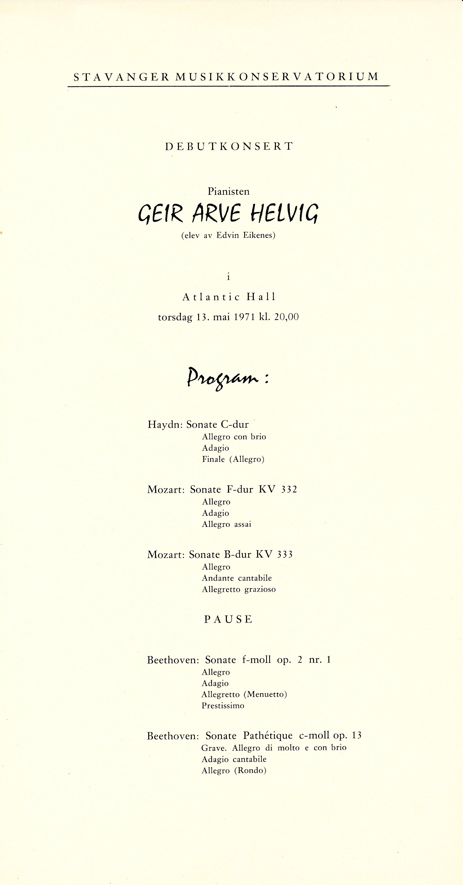 Helvig Beethoven: Sonate op. 2 nr. 1 i f-moll Beethoven: Sonate op. 13 Pathetique Haydn: Sonate i C-dur Mozart: Sonate i F-dur Mozart: Sonate i B-dur Flygel: Petrov Sted: Studio 1, Rogaland Musikkonservatorium Dato: Ukjent, men må være fra perioden 1971–1978. |
