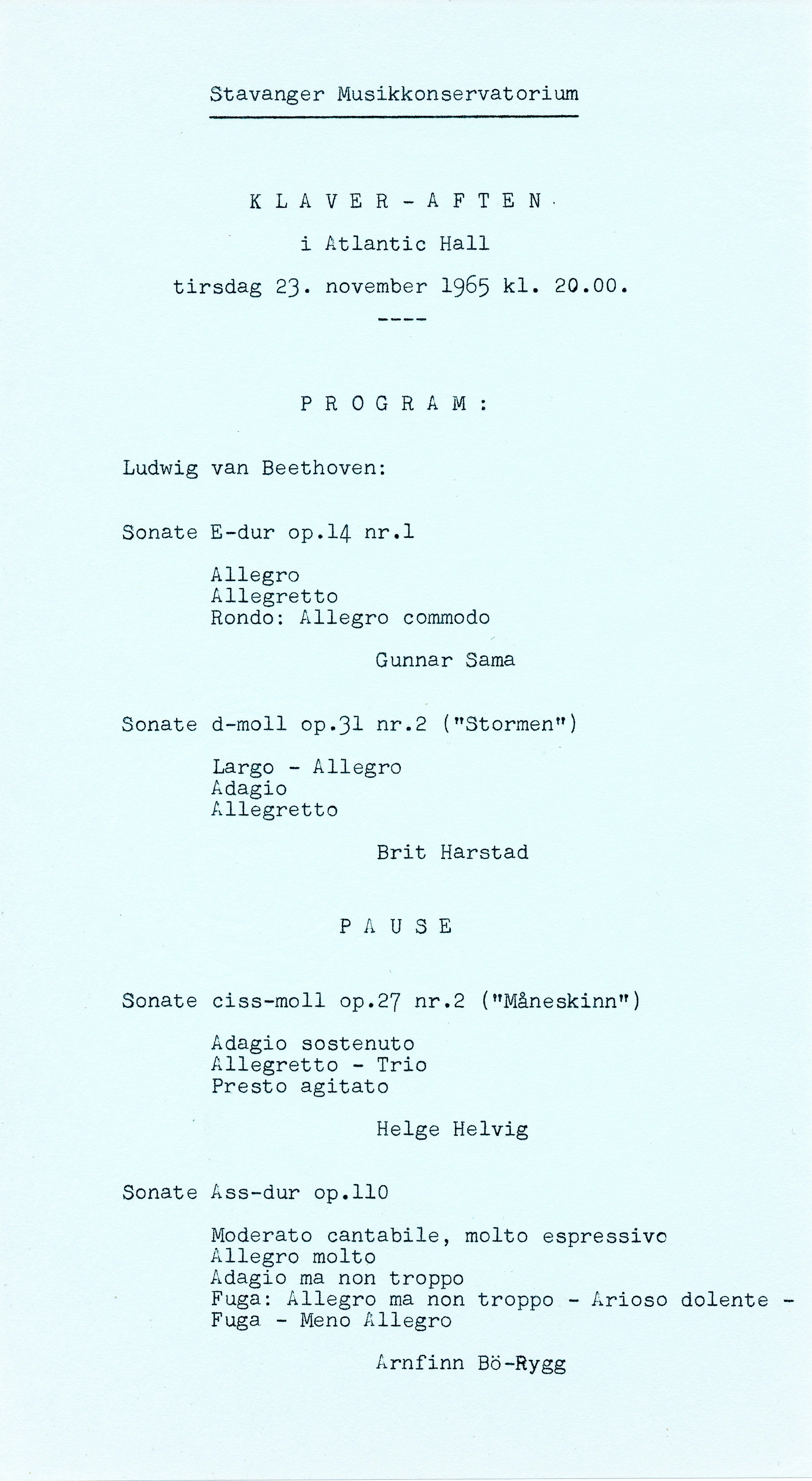 Helvig Beethoven: Sonate op. 31 nr. 2 (d) Flygel: Petrov Sted: Studio 1, Rogaland Musikkonservatorium Dato: 16. november 1971 |